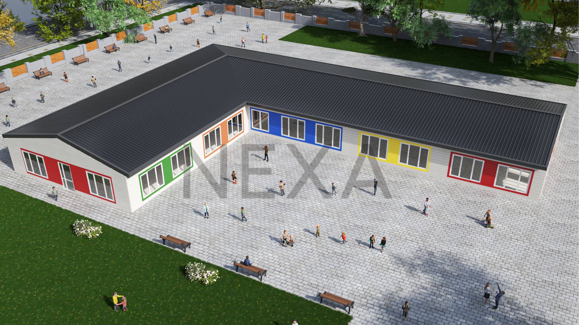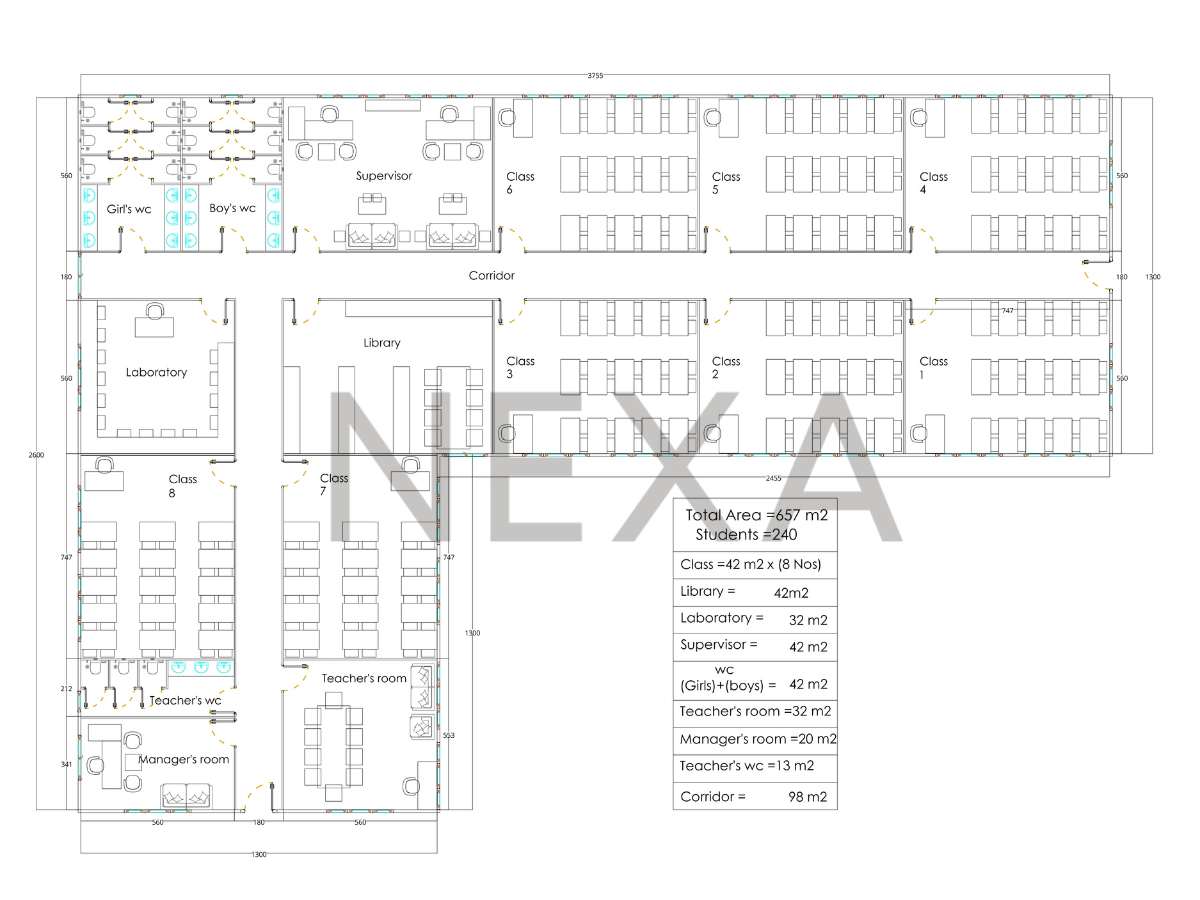 في ظل التحديات التي تواجه قطاع التعليم، تبرز مدرسة جاهزة كحل عملي وفعال لتوفير بيئة تعليمية متكاملة بسرعة وكفاءة. تقدم Nexa Prefab نموذج مدرسة جاهزة مميز مكونة من طابق واحد تضم 8 فصول دراسية، مصممة لتلبية احتياجات التعليم الأساسي والثانوي.