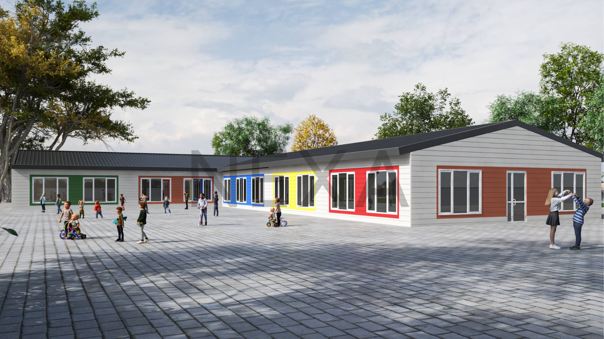 +المدرسة النموذجية الجاهزة هي مبنى مُشيّد باستخدام مكونات جاهزة تُصنّع خارج الموقع في مصنع، ثم تُنقل إلى موقع المدرسة للتجميع. تتيح هذه الطريقة بناءً أسرع، وتوفيرًا في التكاليف، ومراقبة عالية الجودة بفضل بيئة المصنع المُتحكم بها.