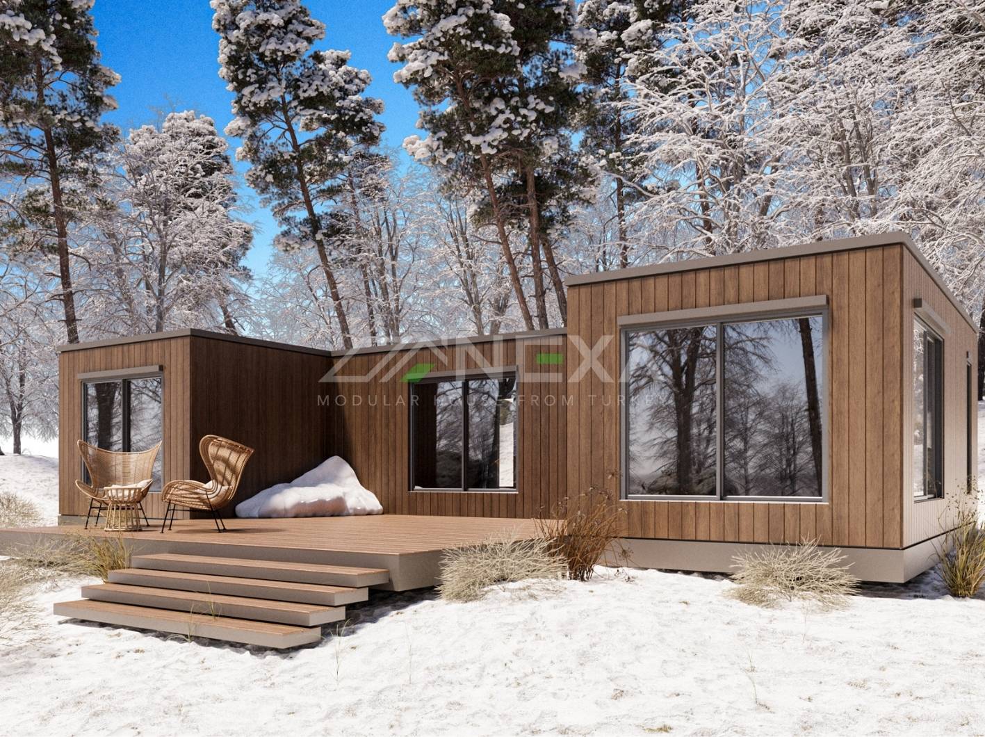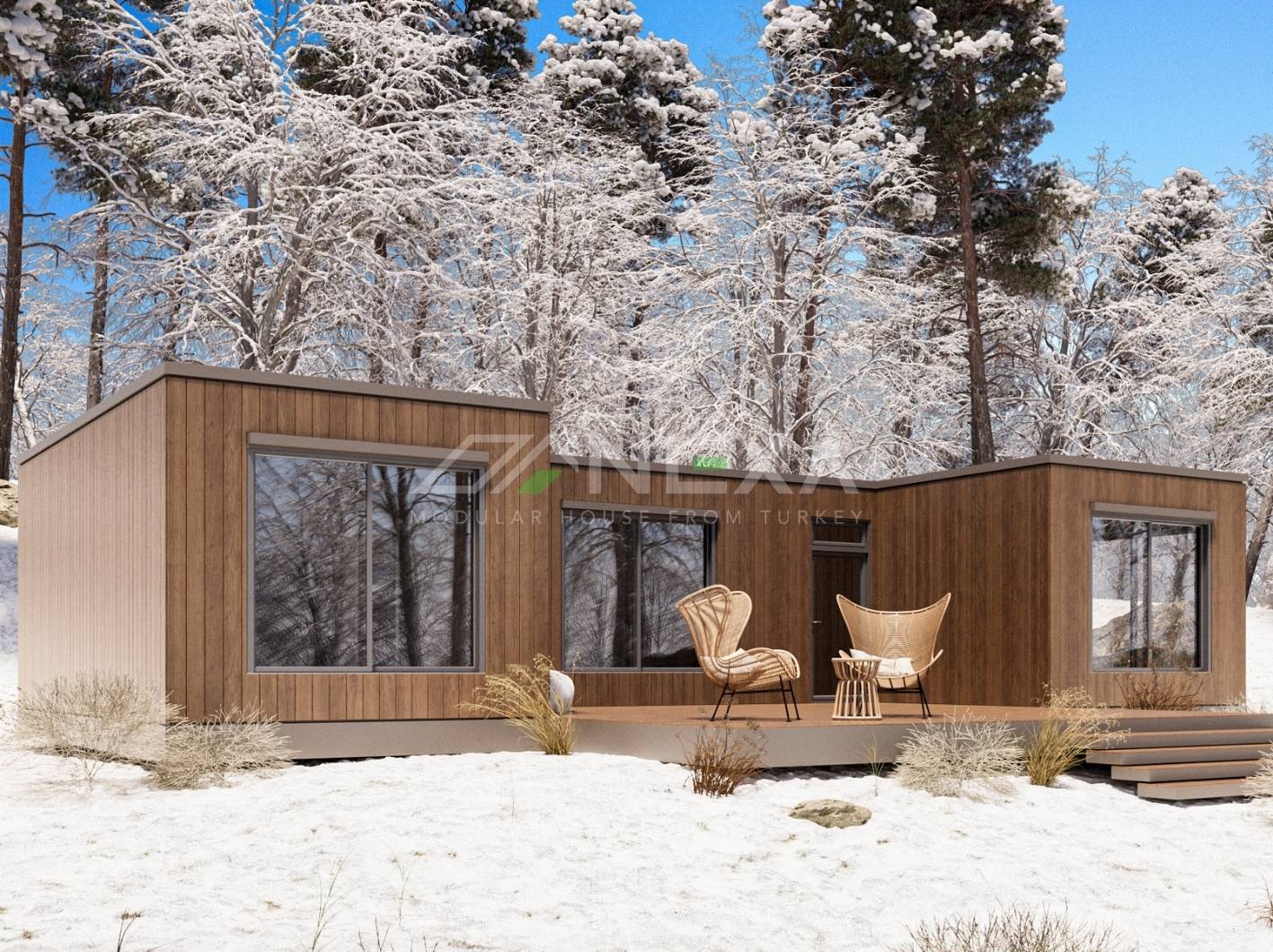We use composite aliminium metal panels and partial Thermawood or WPC for exterior cladding, ensuring a modern, weather-resistant finish. To provide superior thermal efficiency, rock wool insulation, making them ideal for all climates. Wall thicnkess is 180 mm - İnterior Finish